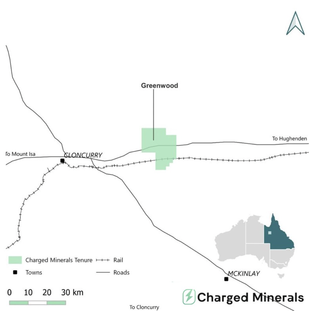 Cloncurry, Queensland, Australia Charged Minerals are the 100% owners of the Greenwood project. Located 45 km east of Cloncurry in Queensland, Australia. Cloncurry is serviced by road, rail and other mining infrastructure being close to Mt Isa a major base metals mining centre and agricultural hub.